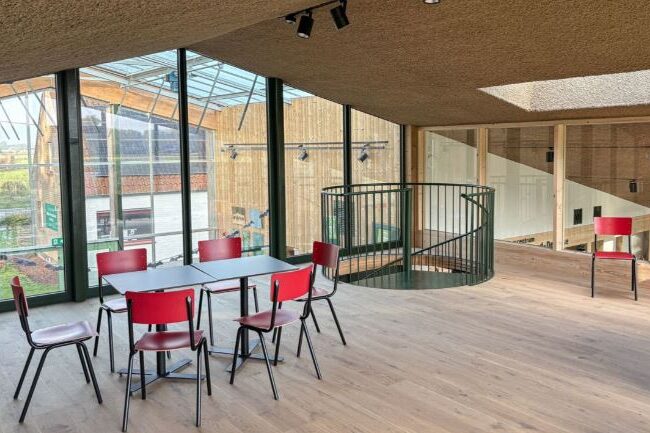 Het ontwerp van De Pulse is ook maximaal circulair met het oog op hergebruik en flexibele aanpasbaarheid. EA+ architecten en ingenieurs combineerde de recuperatie van de bestaande loodsmuren met houtbouw. De houten I-liggers minimaliseren het materiaalgebruik. De oude hoevewoning werd ingevuld als een bureauruimte en een tijdelijke ontvangstruimte. Stijn: “We ontwerpen volgens het motto ‘ruwbouw is afbouw’, dus we voegen geen lagen toe als dat niet nodig is. De technieken in het gebouw zijn in opbouw en makkelijk aanpasbaar.”